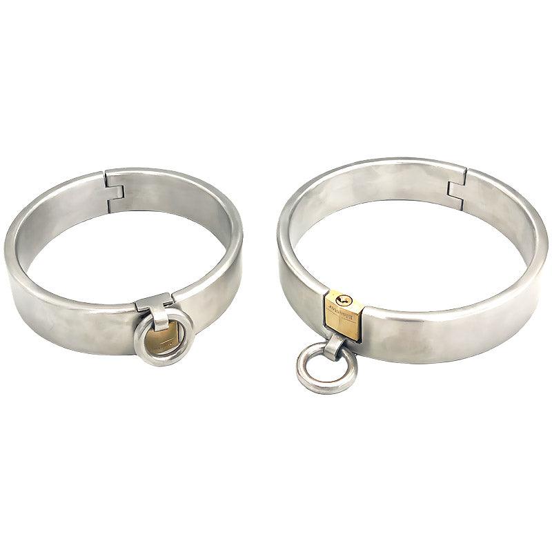 BDSM জগতে প্রবেশ করুন আমাদের এলিট বন্ডেজ কলারগুলির মাধ্যমে, যা পেশাদার-গ্রেড স্টেইনলেস স্টীল থেকে তৈরি, গুরুতর অনুশীলনকারীদের জন্য উপযুক্ত, পৃথক মহিলা এবং পুরুষ সাইজে উপলব্ধ, মহিলাদের জন্য ১১.৭ সেমি এবং পুরুষদের জন্য ১৩.৫ সেমি প্রদর্শন করে, সজ্জিত: