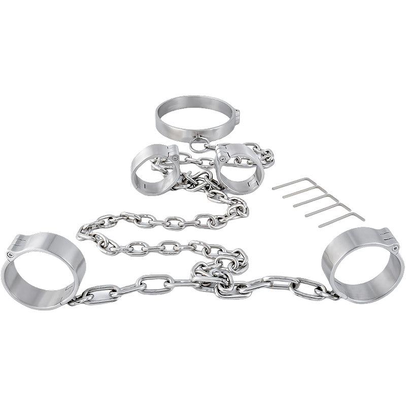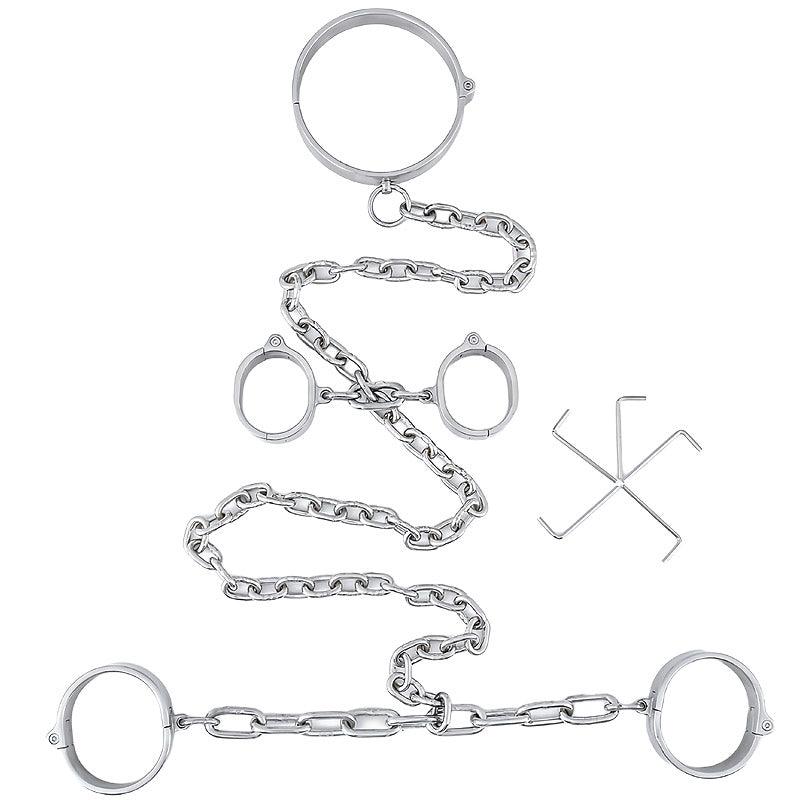 Vrouwelijke maat: handboeien 3CM hoog, 0.5CM dik, binnendiameter 57*47MM, boeien 3CM hoog, 0.5CM dik, binnendiameter 77*65MM, halsband 3CM hoog, 0.5CM dik, binnendiameter 118MM, halsband naar boeien kettinglengte ongeveer 120cm, handboeien kettinglengte ongeveer 5cm, boeien kettinglengte ongeveer 36cm.